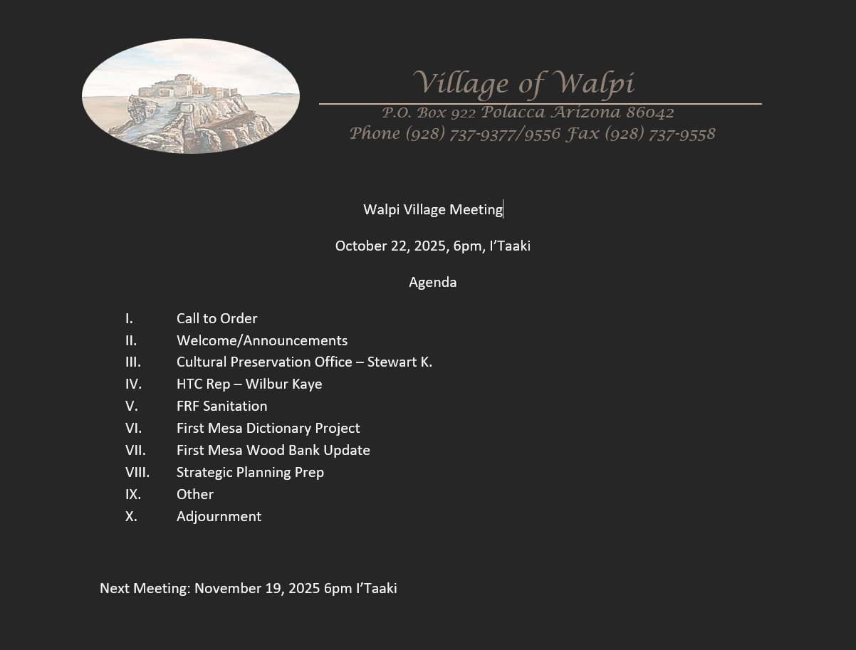 Walpi Village Meeting October 22, 2025 6pm I'Taaki